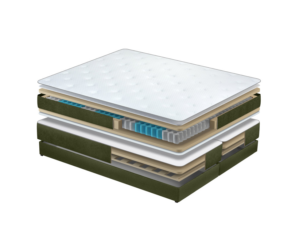 Baza este facuta din lemn masiv, uscat in mediu controlat pentru a crea un cadru stabil cu durabilitate ridicata care sa nu scartaie in timp. Arcurile impachetate individual 7Z Green Pocket® din interiorul saltelei asigura un confort ortopedic si anatomic excelent.