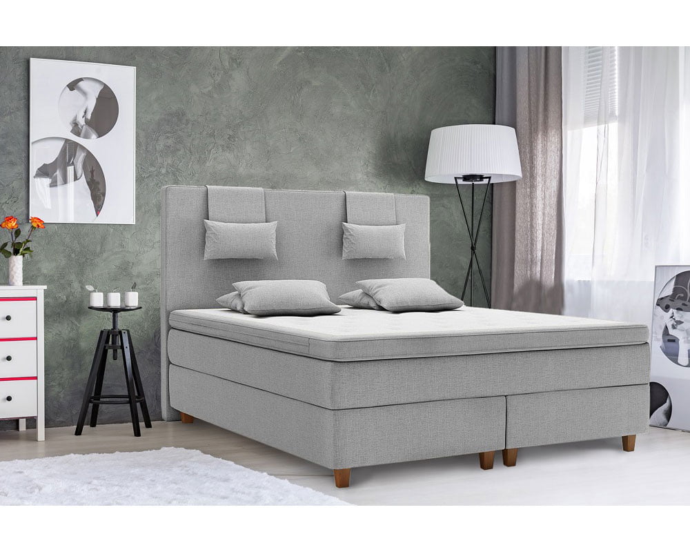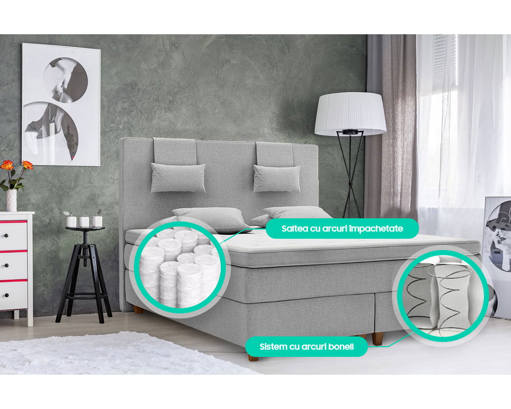 Sistemul de arcuri de doua proprietati diferite (baza pat arcuri bonell, saltea arcuri pochet) imparte greutatea intr-un mod uniform, asigura o sprijinire ortopedica perfecta si un confort exceptional pe termen lung. Paturile boxspring au inceput sa devina un trend nou care nu numai ca arata foarte bine dar reprezinta si o categorie exclusiva care merita achizitionata pentru durabilitatea si confortul lor. Miezurile si topper-urile de pat confera confort maxim si un somn relaxant. Inaltimea Patului Boxpsring este de 70 cm.