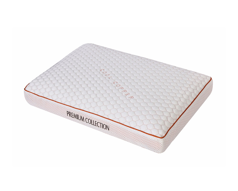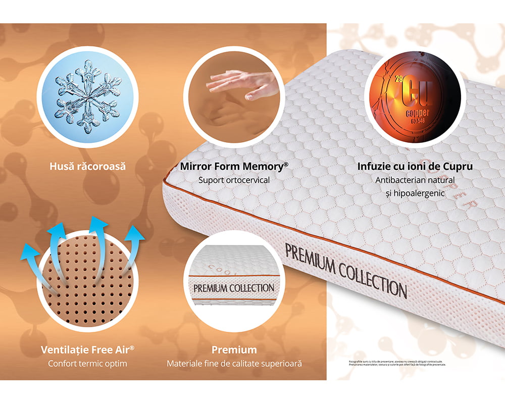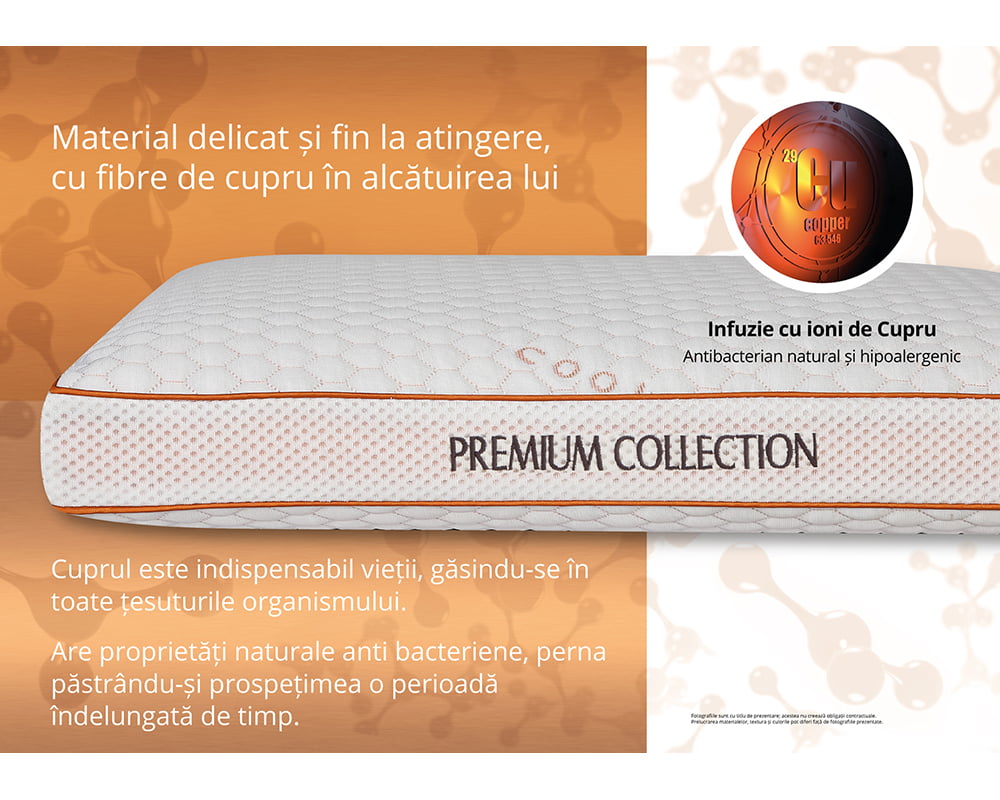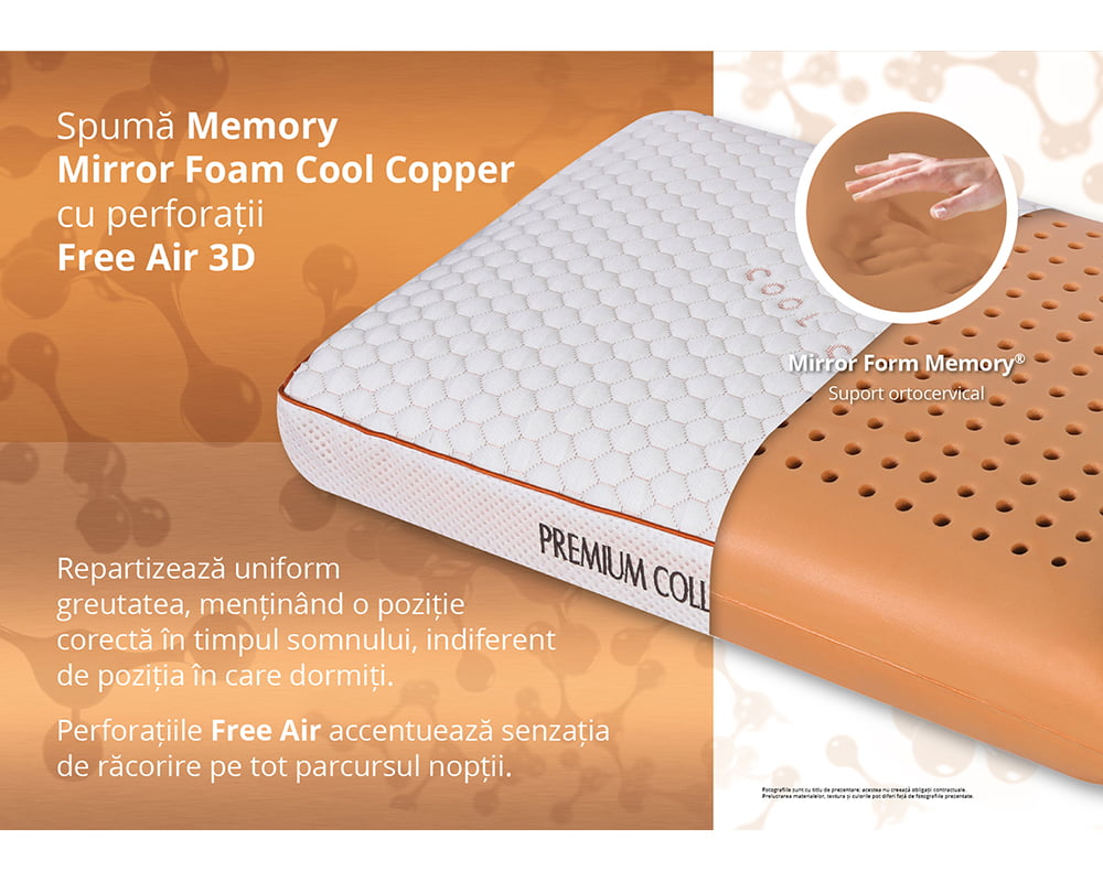 Perna Cool Copper ofera o sustinere excelenta a capului si a gatului datorita spumei Memory Mirror Foam® care se muleaza pe cap, gat si umeri pentru o pozitie naturala a corpului, este creata din materiale de calitate superioara. Cuprul din tesatura si compozitia spumei poliuretanice are proprietati hipoalergenice naturale si disipa umiditatea foarte rapid, impiedicand dezvoltarea bacteriilor pe tesatura. Sistemul de perforatii impreuna cu tesatura Free Air® 3D ajuta la mentinerea unui mediu uscat, fara mirosuri si acarieni. Spuma Memory Mirror Foam® elimina presiunea din jurul capului, gatului si umerilor, si ajuta la mentinerea unei pozitii corecte in timpul somnului. Tesatura cu fire reci mentine o temperatura confortabila in timpul somnului. Structura pernei este prevazuta cu canale de aerisire pentru preluarea caldurii excesive si umiditatii in timpul somnului. Mentinerea unui mediu uscat previne aparitia microbilor si mucegaiurilor, principalii factori in aparitia alergiilor. Husa pernei este lavabila si fabricata dintr-o tesatura moale si delicata.