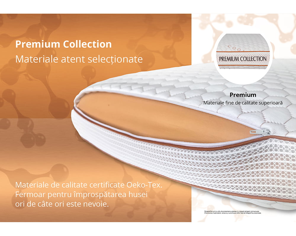 - Confort termic: tesatura cu fire reci mentine o temperatura confortabila in timpul somnului.Structura pernei este prevazuta cu canale de aerisire pentru preluarea caldurii excesive si umiditatii in timpul somnului. Mentinerea unui mediu uscat previne aparitia microbilor si mucegaiurilor, principalii factori in aparitia alergiilor.