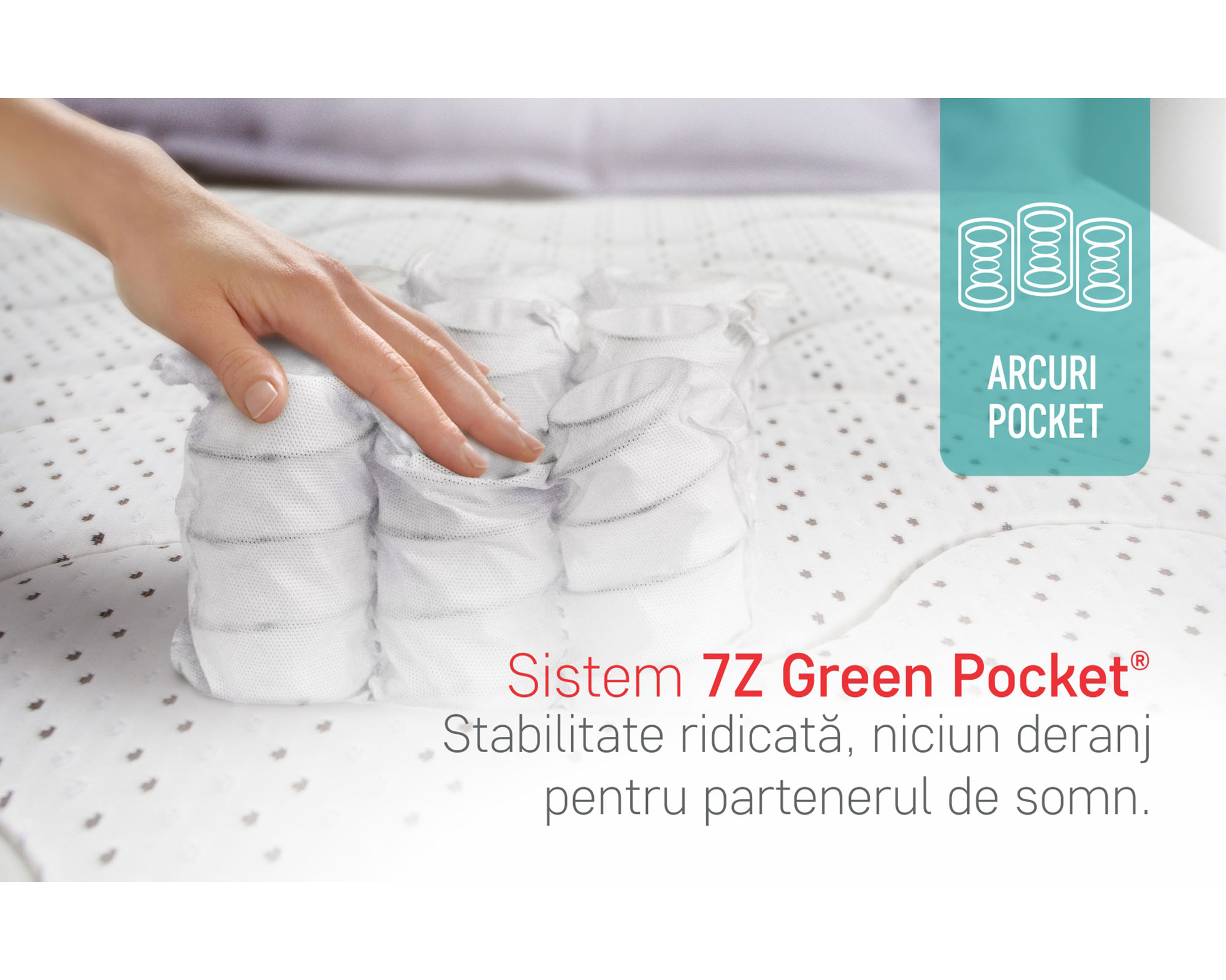 - Arcuri impachetate in casete independente din material textil cu 7 zone diferite de elasticitate, elimina astfel efectul de „val” in cazul miscarilor bruste pe saltea in timpul somnului, ceea ce face ca partenerul sa nu fie deranjat. Cele 7 zone de elasticitate creeaza posibilitatea adaptarii saltelei la cele 5 greutati si forme diferite ale corpului uman (cap, trunchi, sold, genunchi, glezna). Rolul ei este de a asigura elasticitatea optima si a asigura un suport ferm. Greutate maxima recomandata/persoana: 120 kg.