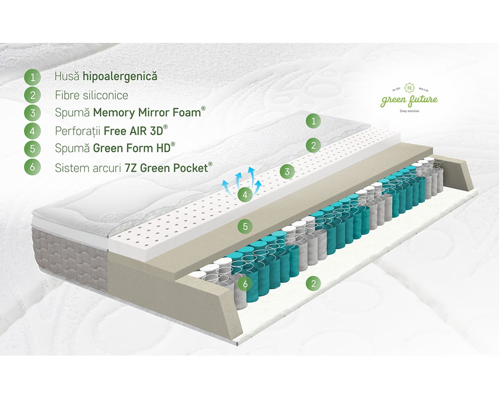 Spuma elastica Green Form HD® cu celulatie deschisa vine in completarea tehnologiei 7Z Green Pocket®, asigurand sustinerea anatomica a corpului si o pozitie corecta a coloanei fara dureri de spate in timpul somnului.