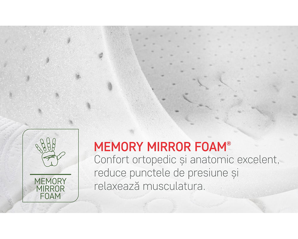 Stratului de confort i se adauga 5 cm de spuma Memory Mirror Foam® care reactioneaza la caldura corpului si se muleaza pe acesta eliminand punctele de presiune in timpul somnului pentru a relaxa muschii si a asigura o circulatie a sangelui corespunzatoare.