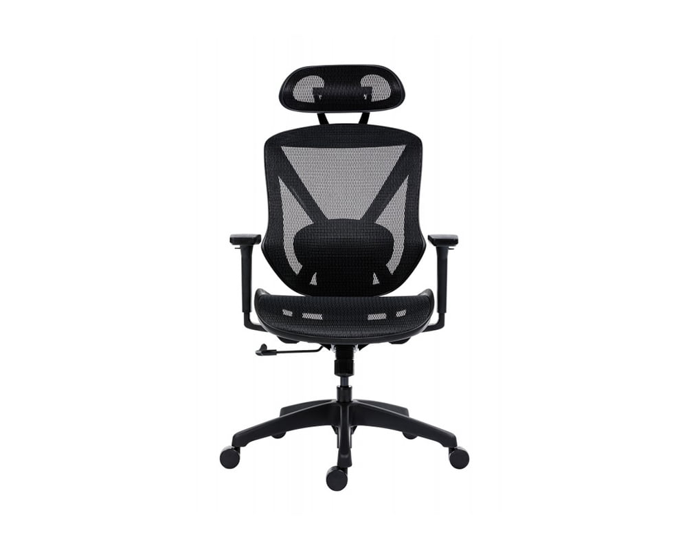 Tetiera scaunului Aero Pro este tapitata cu mesh si reglabila vertical.
